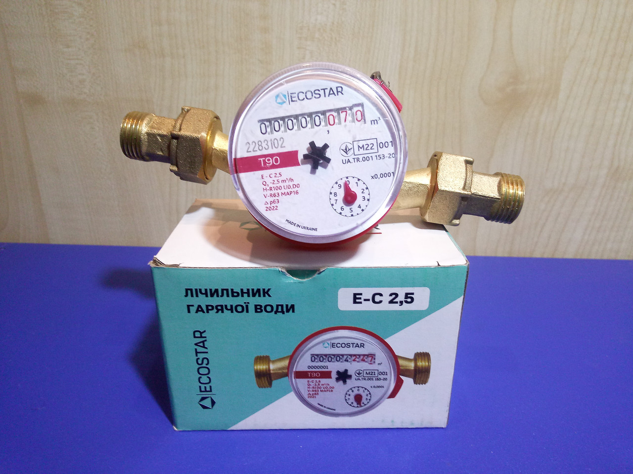 Лічильник води ECOSTAR E-C 2,5 для гарячої води зі штуцерами та гайками — призначений для вимірювання об'єму гарячої води, що протікає напірним трубопроводом.